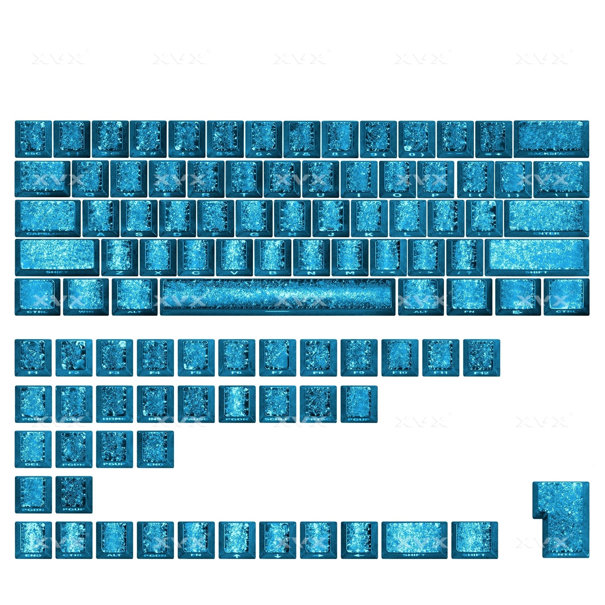 XVX Foil series は中国キーボードメーカーのキーキャップのOEM製造を数多く手掛けている、XVXが設計製造を行なったキーキャップセットです。Cherryプロファイルのキーキャップの表面は金属のように輝くライトブルーのテクスチャです。高級感のある仕上がりです。印字は前側の側面に印刷されています。キー天面のカーボン調を楽しめるデザインです。