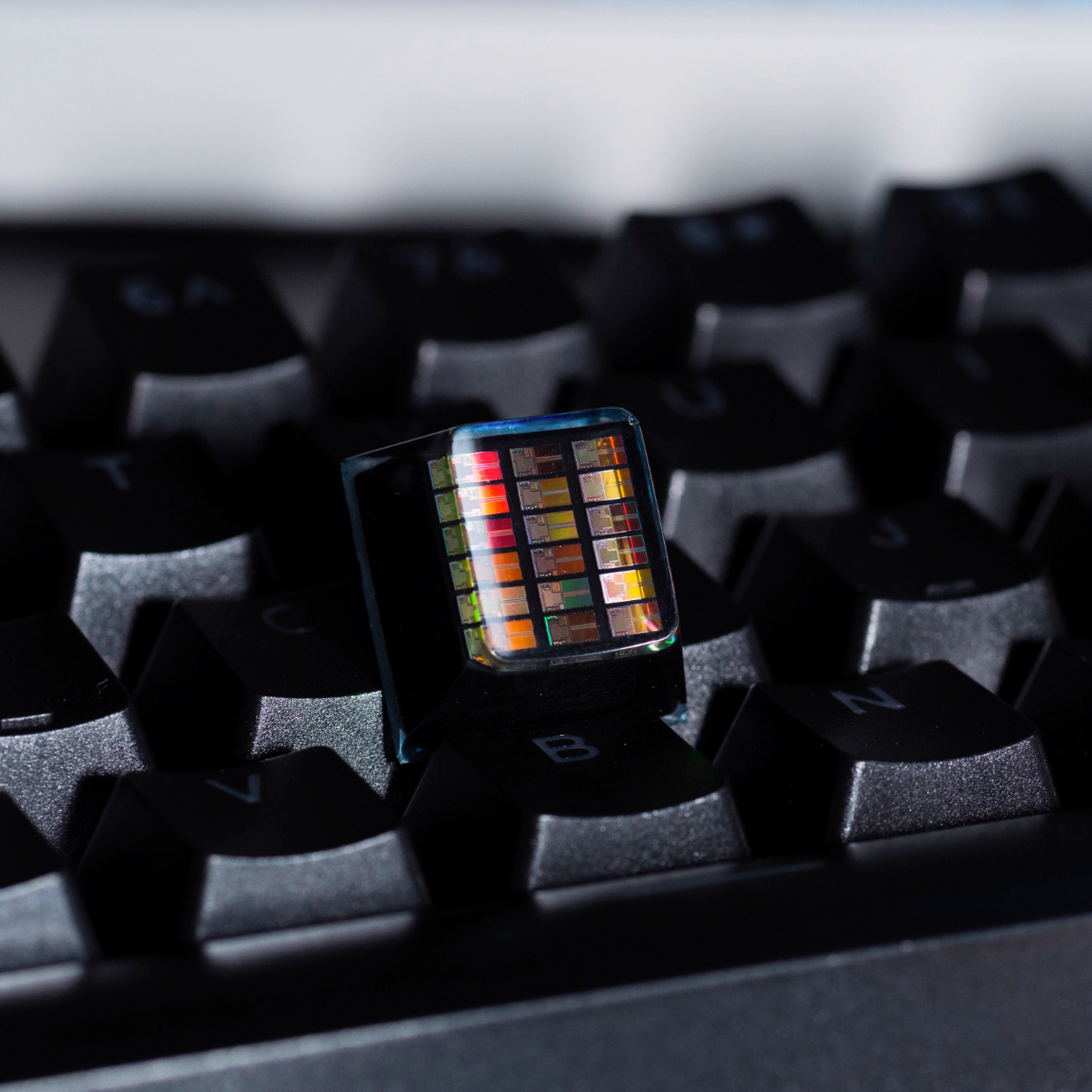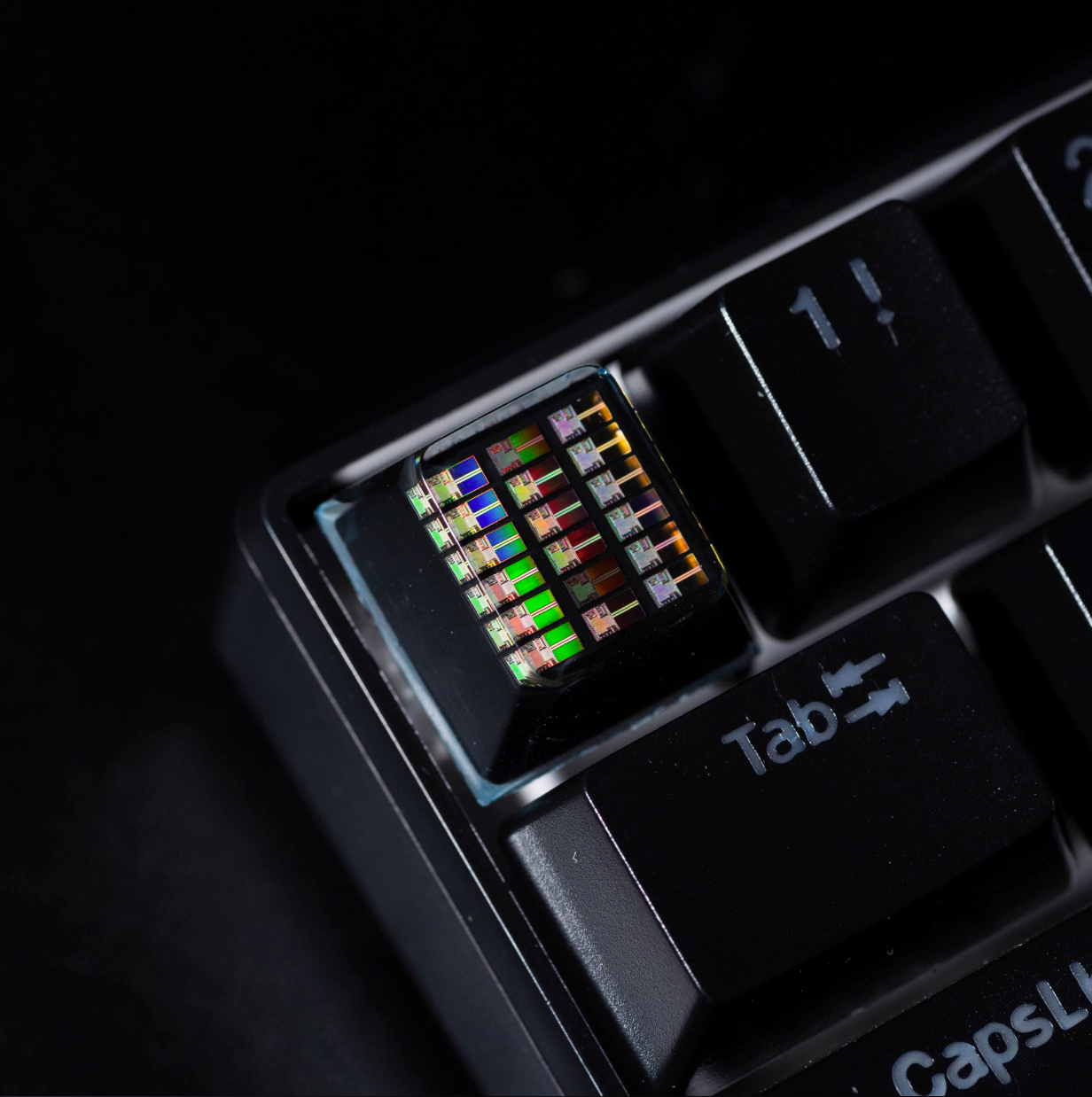 半導体チップのダイを切り出したようなものがレジンの中に入っているアルチザンキーキャップです。お手持ちのキーボードの電子部品感を際立たせます。レジン製です。