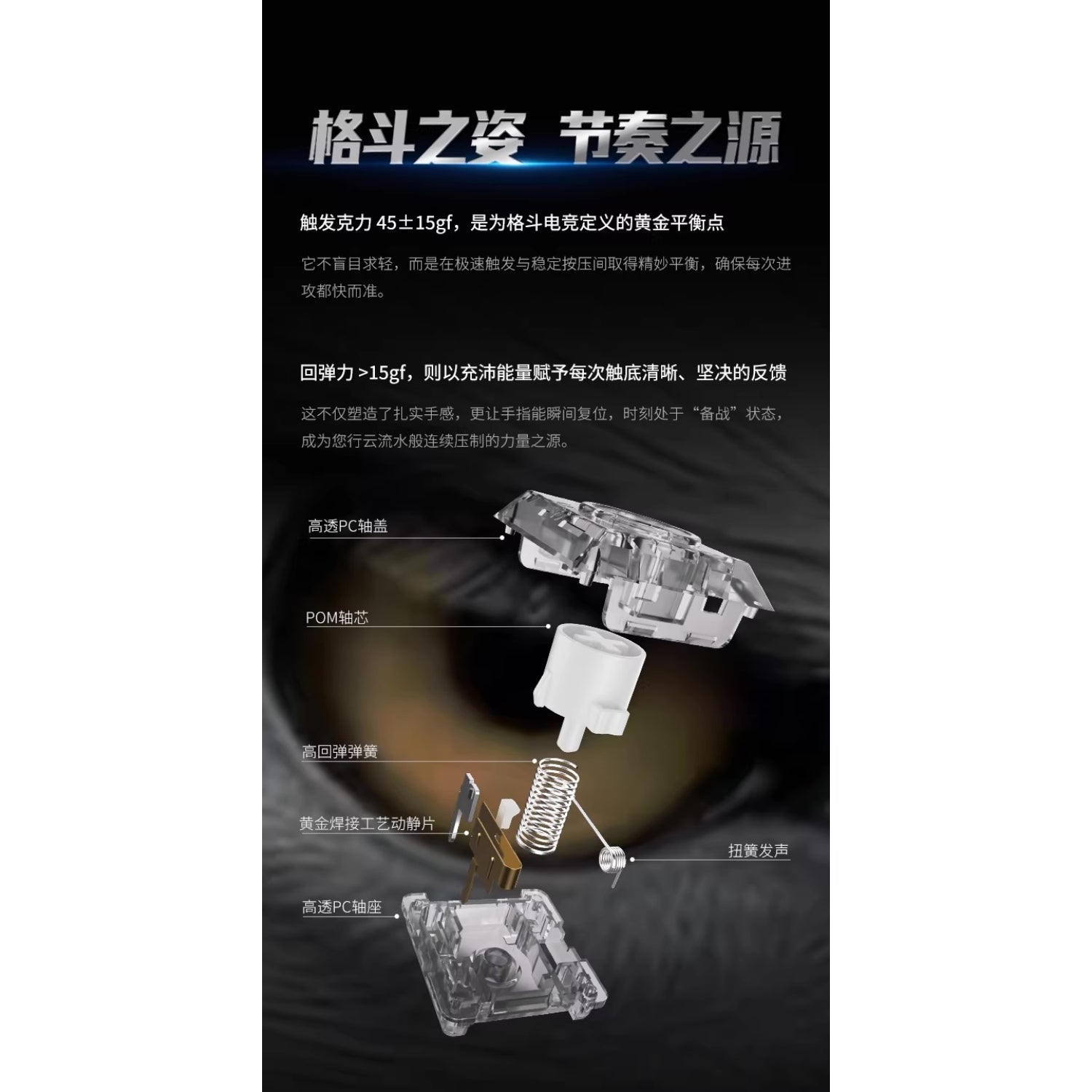 アクチュエーションポイントは1.0mm、トータルトラベルは1.8mmで、アクチュエーションフォースは45±15gf、リターンフォースは15gf以上です。ハウジングはPC、ステムはPOMを使用しています。